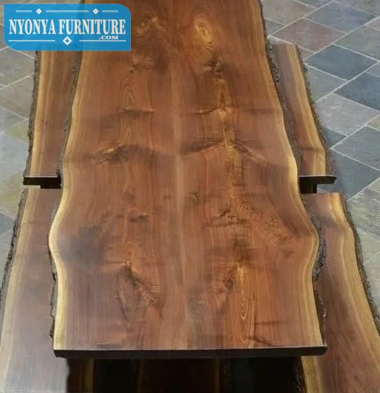 Dengan set meja dengan 4 kursi makan yang panjang, bagian pinggir mej dan kursinya masih dibiarkan terdapat kulit kayu yang cukup tebal.